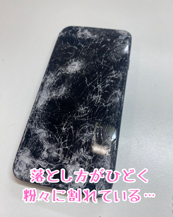 ご覧ください、かなりの重度割れのiPhoneSE3の画面です…。ここまでなると正直基板にも損傷が行ってるのじゃないかと思いますが、音やバイブの反応があったので「画面交換」で修理可能と判断し、受付させていただきました!