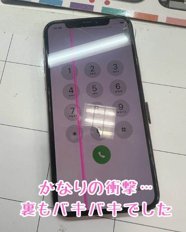修理前の端末は、画面全体がバキバキに割れ、液晶には光線が走るほどのダメージでした。
