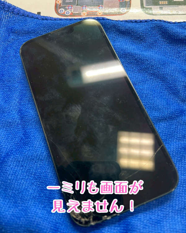 画面が割れてしまっただけでなく、表示が完全に映らず操作もできない状態でのお持ち込みです。