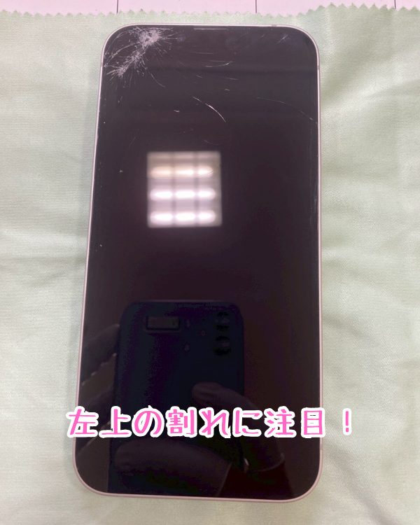 画面左上の割れの確認が出来ます!割れた部分から細かいひび割れが起こっており