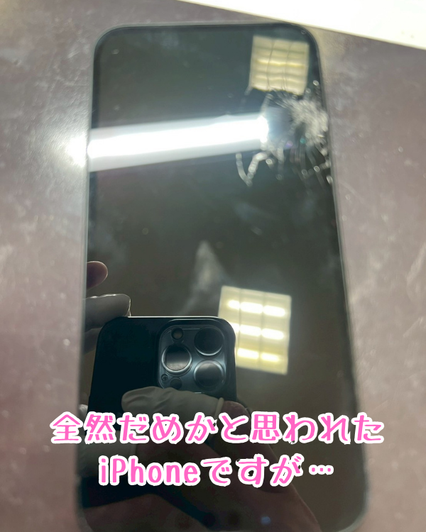 お持ち込みいただいた端末は、画面のガラスが粉々に砕けているだけでなく、パネル自体が内側に凹んでしまうほどのダメージを受けていました。光すら一切漏れてこない真っ暗な状態で、一見すると「もう手遅れでは?」と思わせるほどの破損具合でした。
